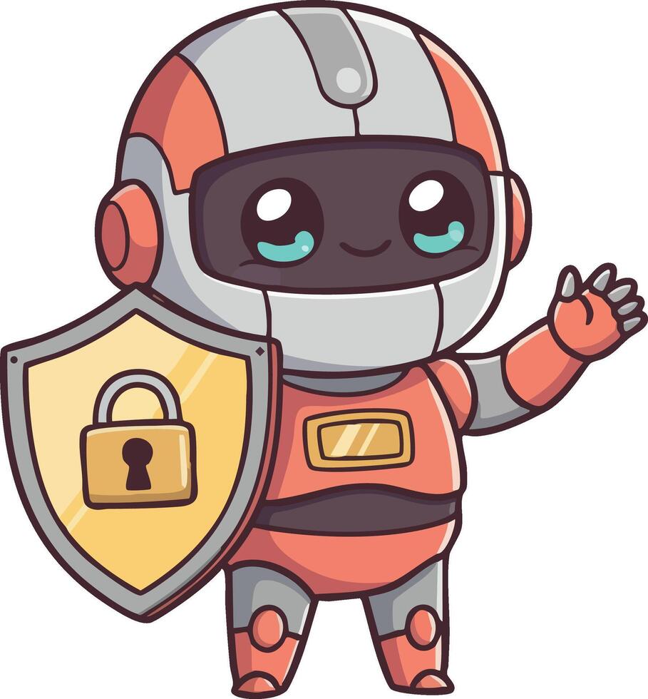 Cute robot character holding shield with lock symbol representing digital security and protection concepts in style Pro Vector