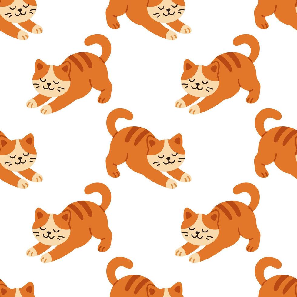 seamless pattern with funny red cats stretching on the floor. Playful kittens lying down in relaxed poses on white background. Pattern cheerful design for children and pet related themes. Pro Vector