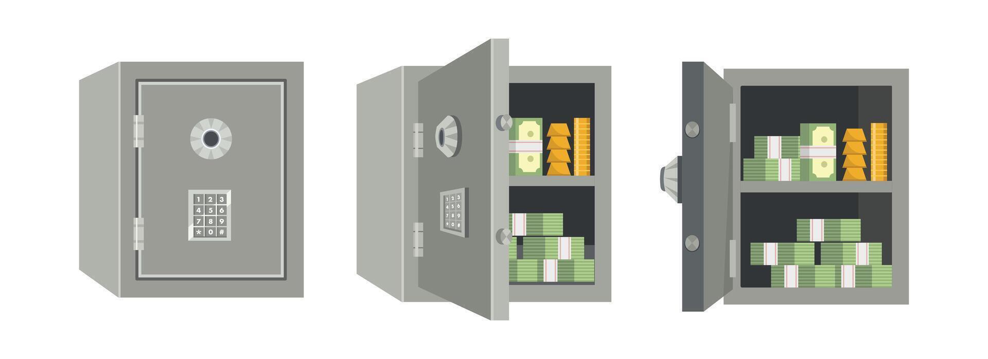 Set of secure deposit box. Money box Collection. Key lock cash box. Digital money security code. Save deposit box in different position. Pro Vector
