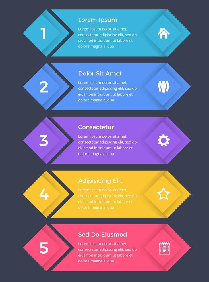 Business infographic design template with five vertical options or steps, process, workflow template, dark background Pro Vector