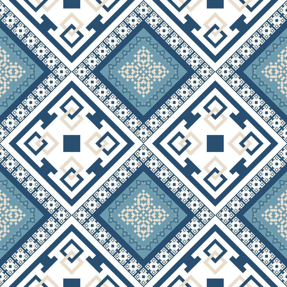 Geometric ethnic patterns in blue, white, and cream create a stunning design background. The seamless arrangement and intricate detailing gives a perfect backdrop for design projects vector