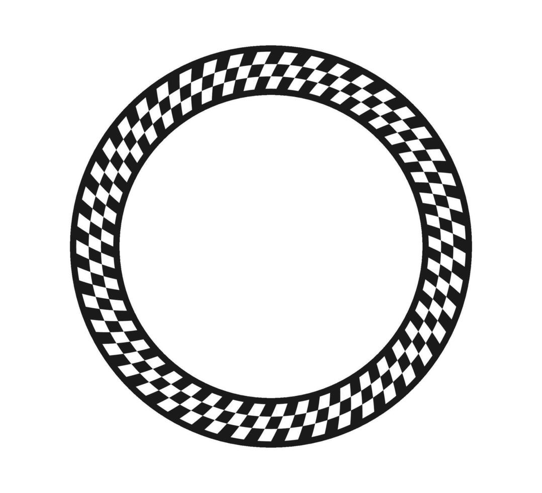 Checkered circle frame. Circle race checker flag pattern. Checkerboard geometric pattern. Black and white rally chess square pattern. Round race frame. illustration Pro Vector