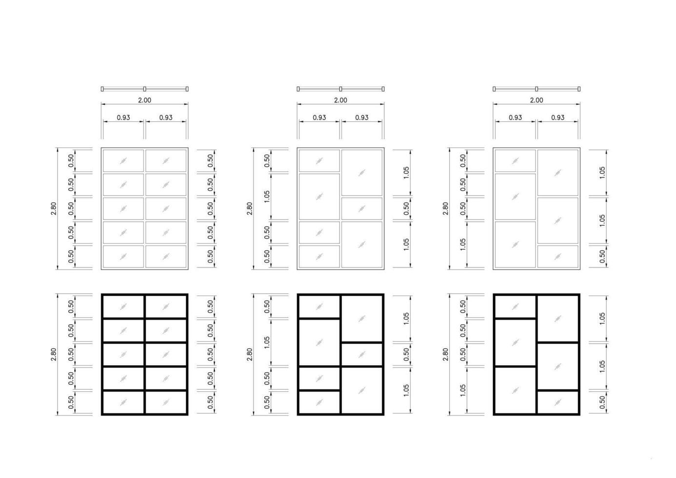 Architectural door and window elevation drawings with detailed dimensions, sections, and frame styles. Includes line weight variations for a design Pro Vector