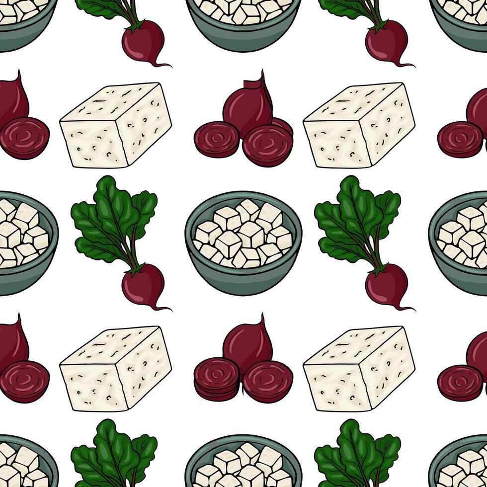 Seamless pattern featuring hand-drawn illustrations of feta cheese, beetroot, and beet greens, arranged in a playful, repeating design. Pro Vector