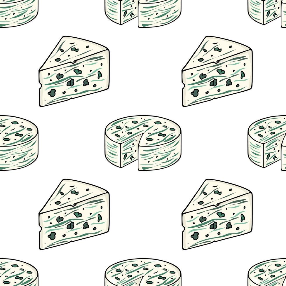Seamless pattern of hand-drawn Dorblu cheese wedges and rounds, featuring a unique blend of creamy off-white and teal green hues, creating a visually appealing and appetizing design ideal for... Pro Vector