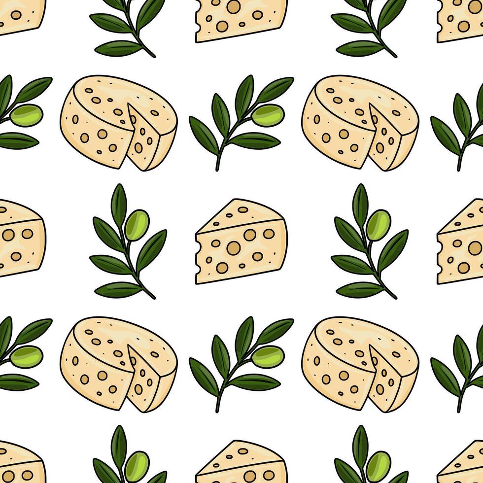 Seamless pattern featuring hand-drawn illustrations of cheese wheels, cheese wedges, and olive branches, creating a charming and appetizing design ideal for culinary branding or packaging. Pro Vector