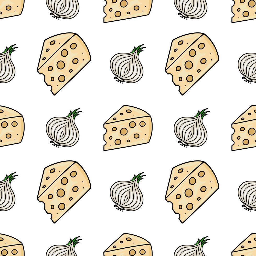 Seamless pattern featuring handdrawn illustrations of cheese wedges and onions, creating a playful and appetizing design ideal for culinary-themed projects. Pro Vector