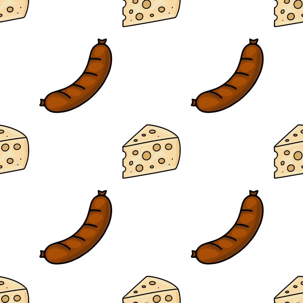 Seamless pattern featuring a playful illustration of brown sausages and yellow cheese wedges, creating a cheerful and appetizing design perfect for food-related projects. Pro Vector