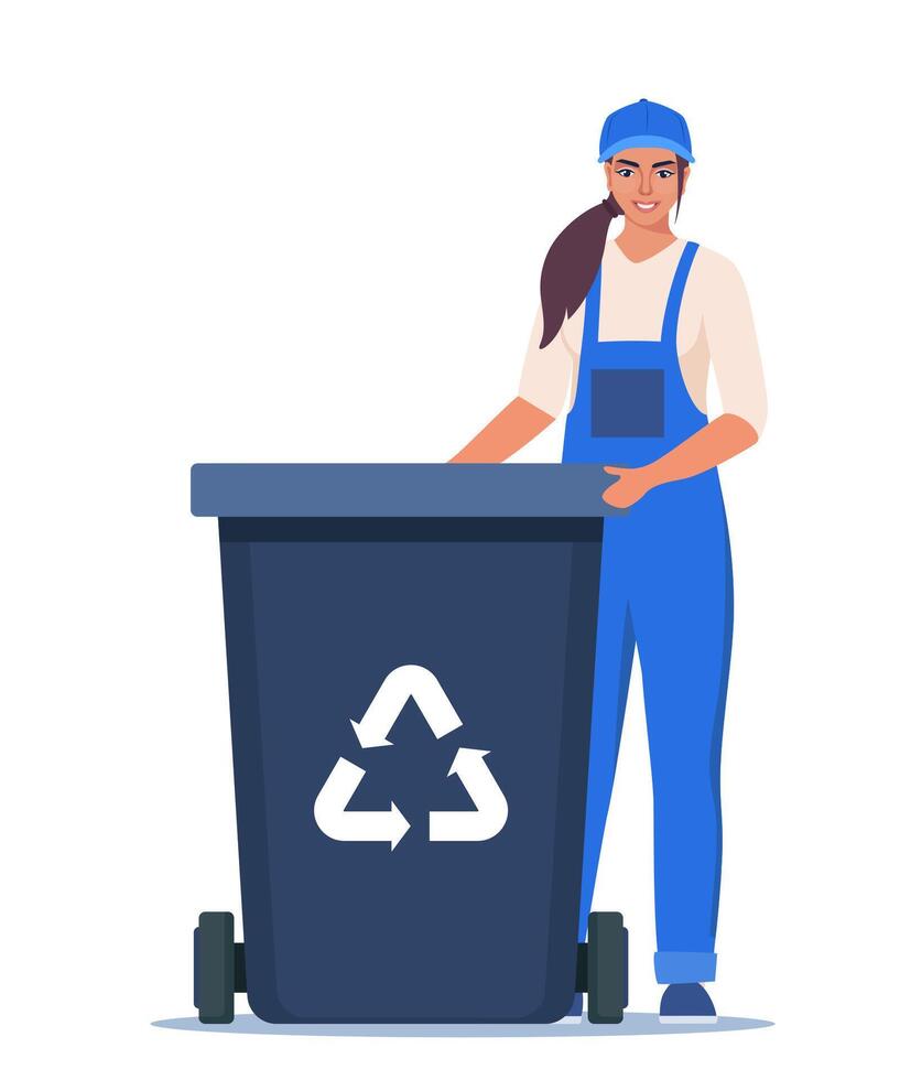 Garbage woman in uniform with trash bin and recycling symbol. Garbage sorting. Zero waste, environment protection concept. illustration. Pro Vector