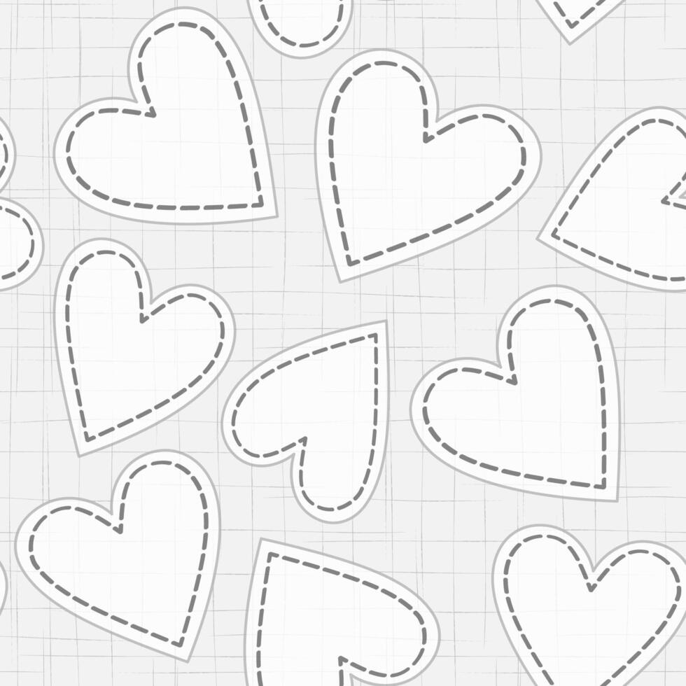 Abstract seamless pattern of hearts. Random hearts with stiches. White hearts on gray background. Heart shaped patches. Monochrome pattern for your valentine design projects Pro Vector