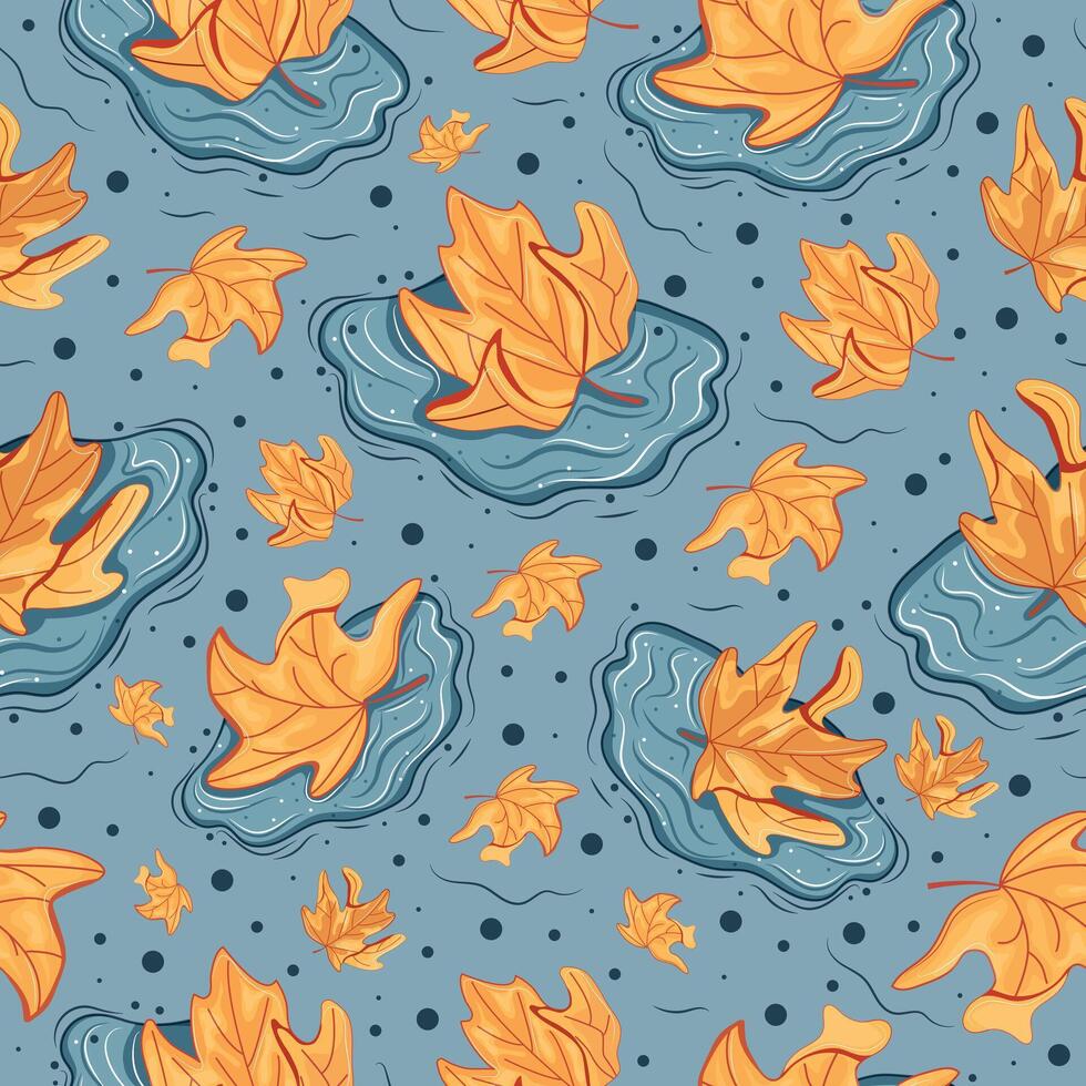 seamless pattern of maple leaf icons in various shapes lying in puddles of water with splashes around on a blue background, for autumn printing, packaging or other designs Pro Vector
