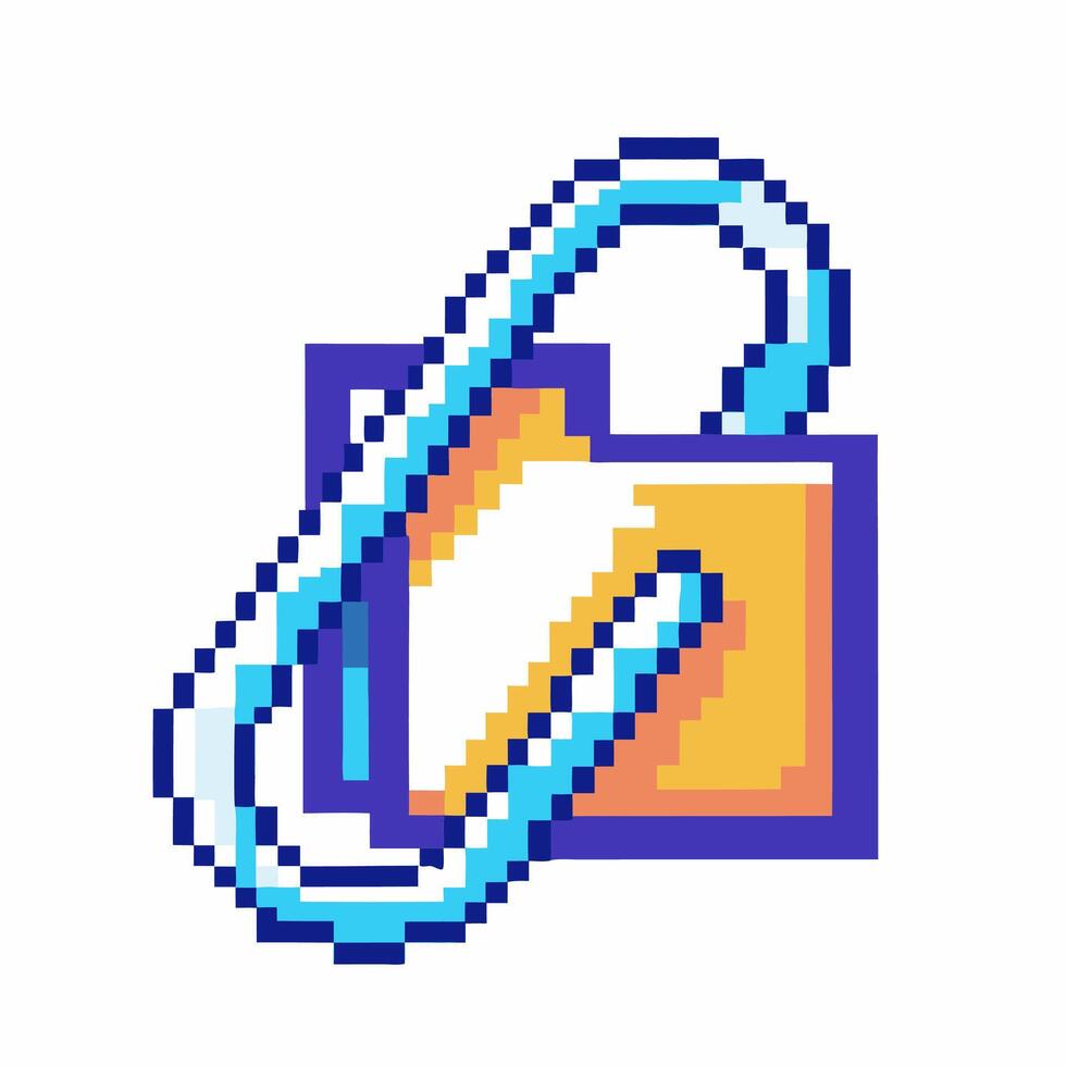 Pixel open padlock icon with chain, digital security unlocked symbol, retro 8 bit design on white background Pro Vector