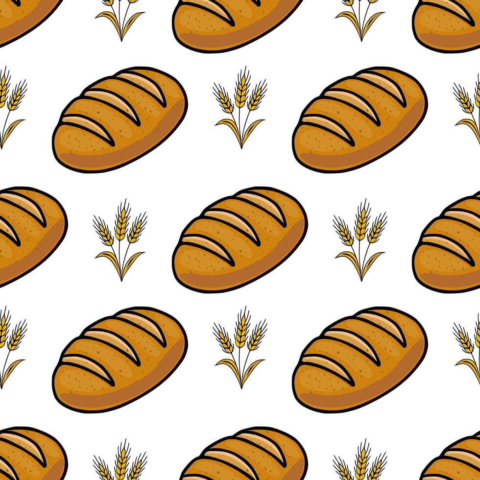 Seamless pattern of rustic brown bread loaves and golden wheat stalks, creating a charming and appetizing bakery design. Pro Vector