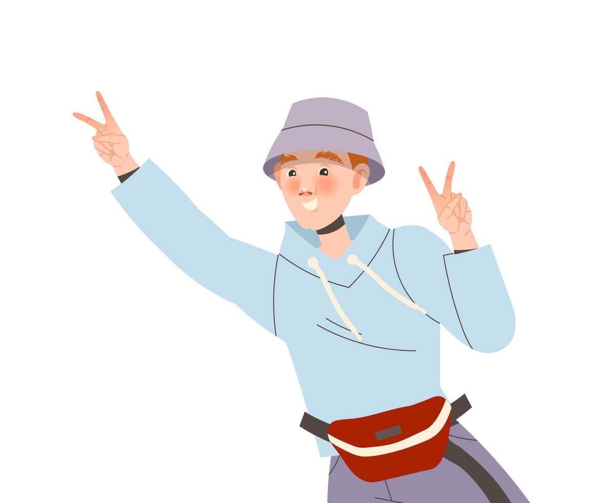 Positive Man Character in Bucket Hat with Smiling Face Showing V Sign Hand Gesture Feeling Euphoric and in High Spirits Illustration Pro Vector