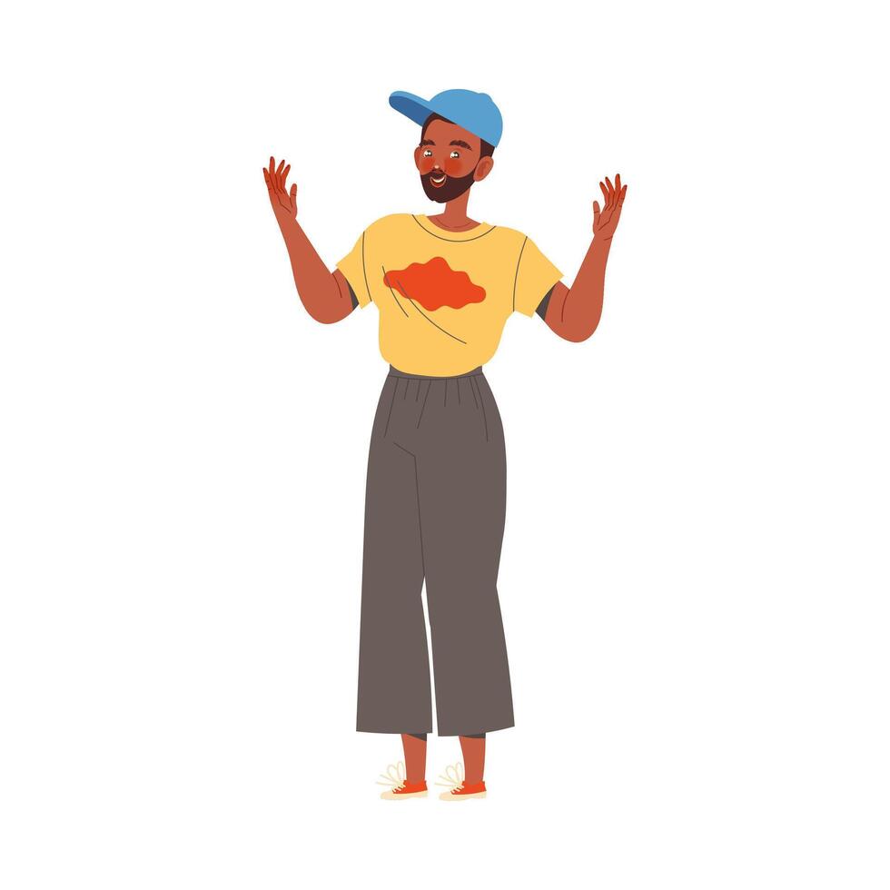 Bearded Man Character in Baseball Cap with Wide Open Arm Showing Hand Gesture Expressing Emotion with Body Language Illustration Pro Vector