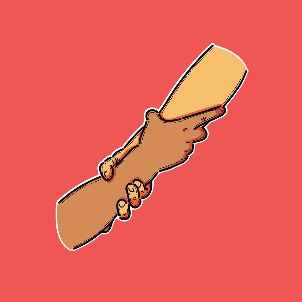 Creative illustration featuring hands clasping in support and unity, set against a bright red background, symbolizing trust, partnership, and assistance. Pro Vector