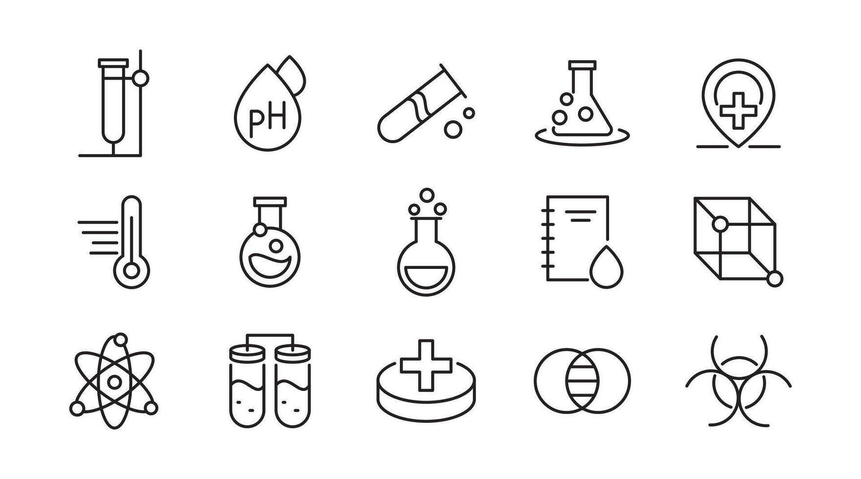 Laboratory and Test line icon set. Laboratory, research, scientist, experiment, lab, chemical, science, toxic, microscope, education, biotechnology line icon set Pro Vector