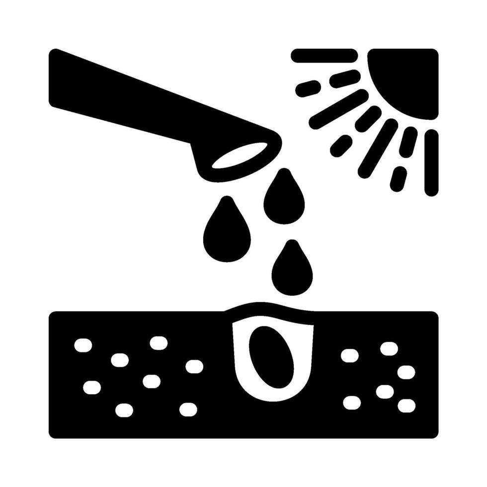 Watering a Seedling Under the Sun's Gentle Rays. A glyph icon showing a stream of water from a pipe or hose, dripping into a small hole in the ground where a seed is being nurtured. Pro Vector