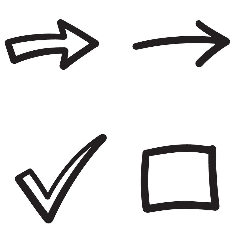 Hand drawn design elements including arrows tick checkmark and open square box for different concepts Pro Vector