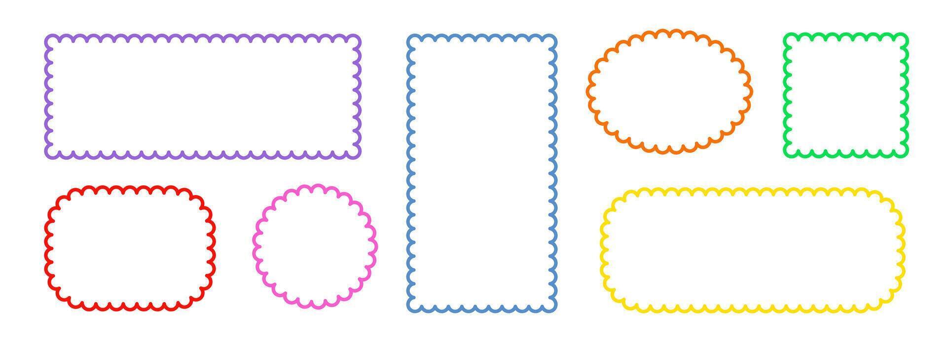 Border frame scallop edge rectangle, oval, round border. Wave scallop squiggle cute simple rectangle border set. Simple wavy squiggly line retro photo picture frame. Pro Vector
