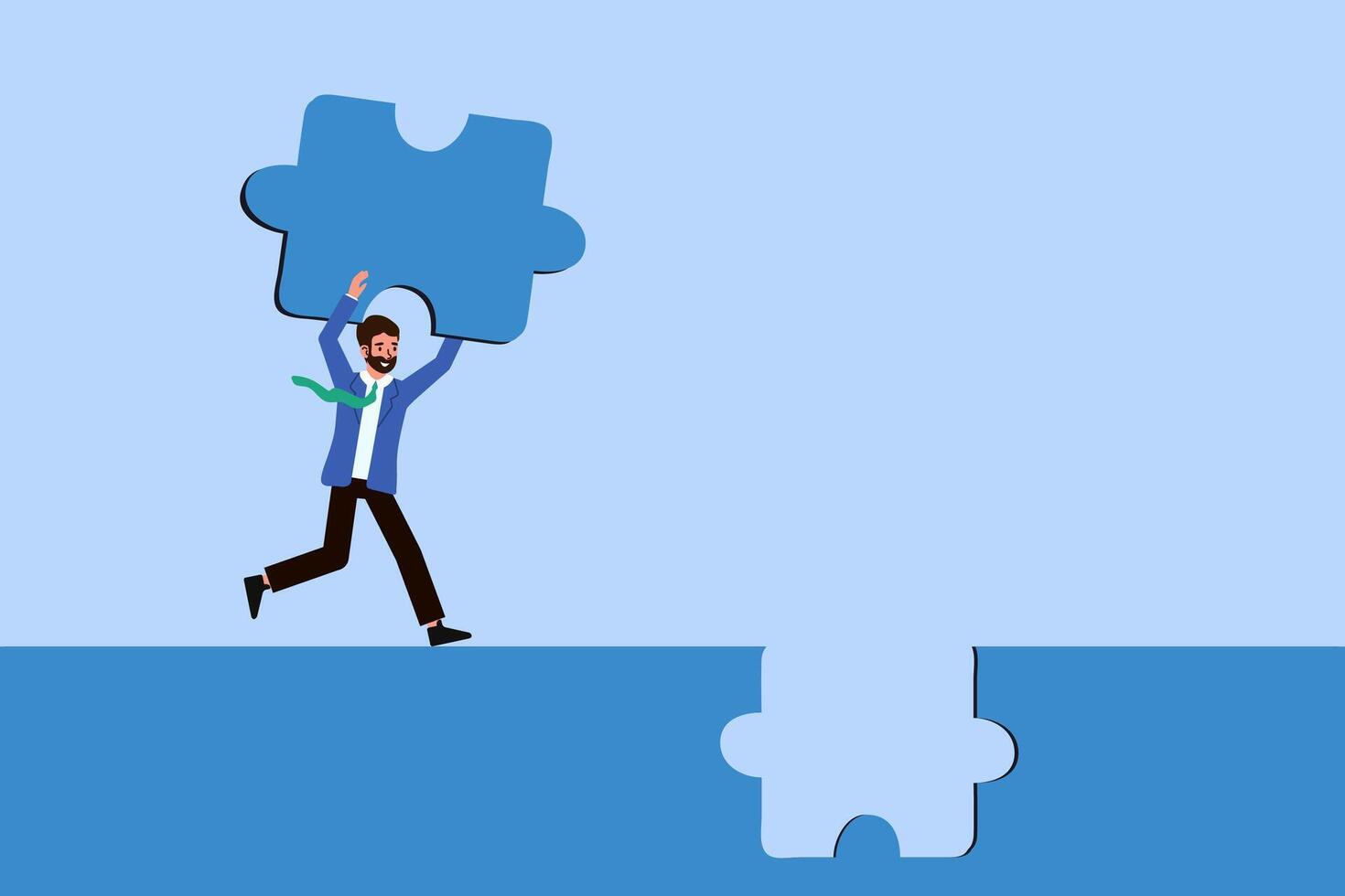 Businessman completes puzzle. solving challenge, achieving success. Business solution, accomplishment concept. Missing piece placed. Pro Vector