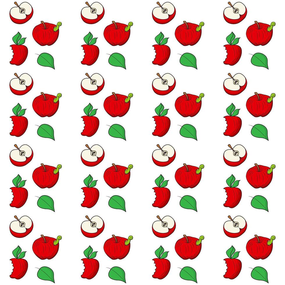 Red apple with a worm, half and bitten apple with green leaves arranged in vertical stripes. Seamless pattern. Pro Vector