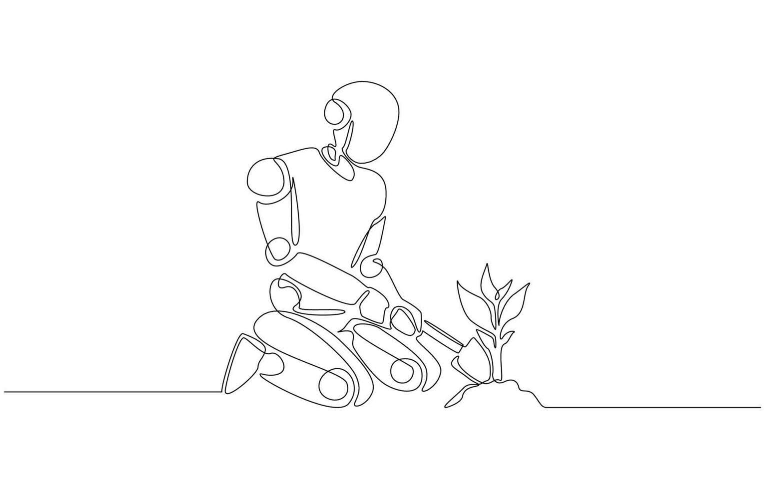 Continuous one line drawing of robot kneeling while planting young tree, harmony between technology and nature, future of AI contributing to environmental protection concept, single line art Pro Vector