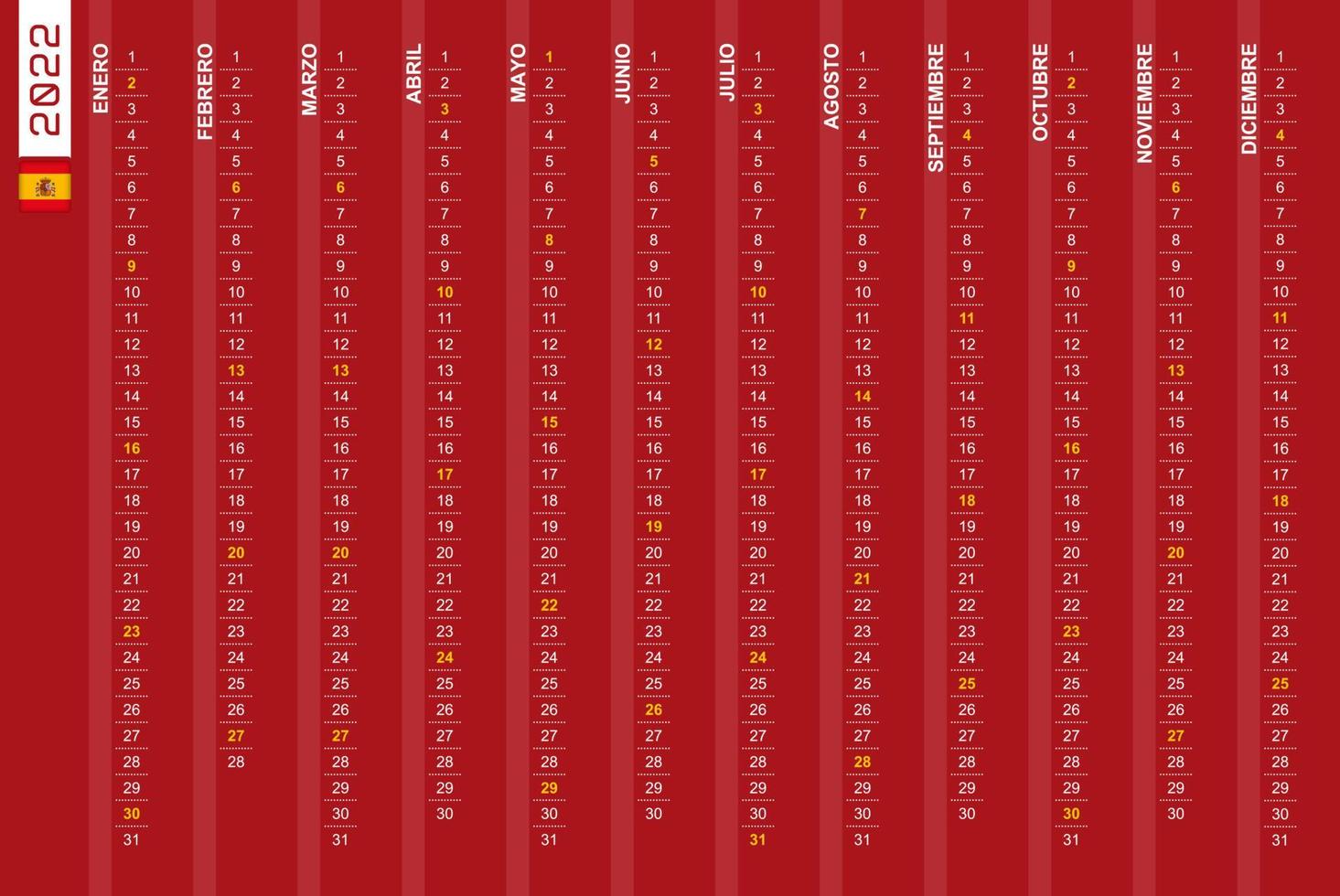 One-row vertical calendar for the year 2022 in Spanish. Spanish calendar for 2022 with highlighted Sundays. Pro Vector