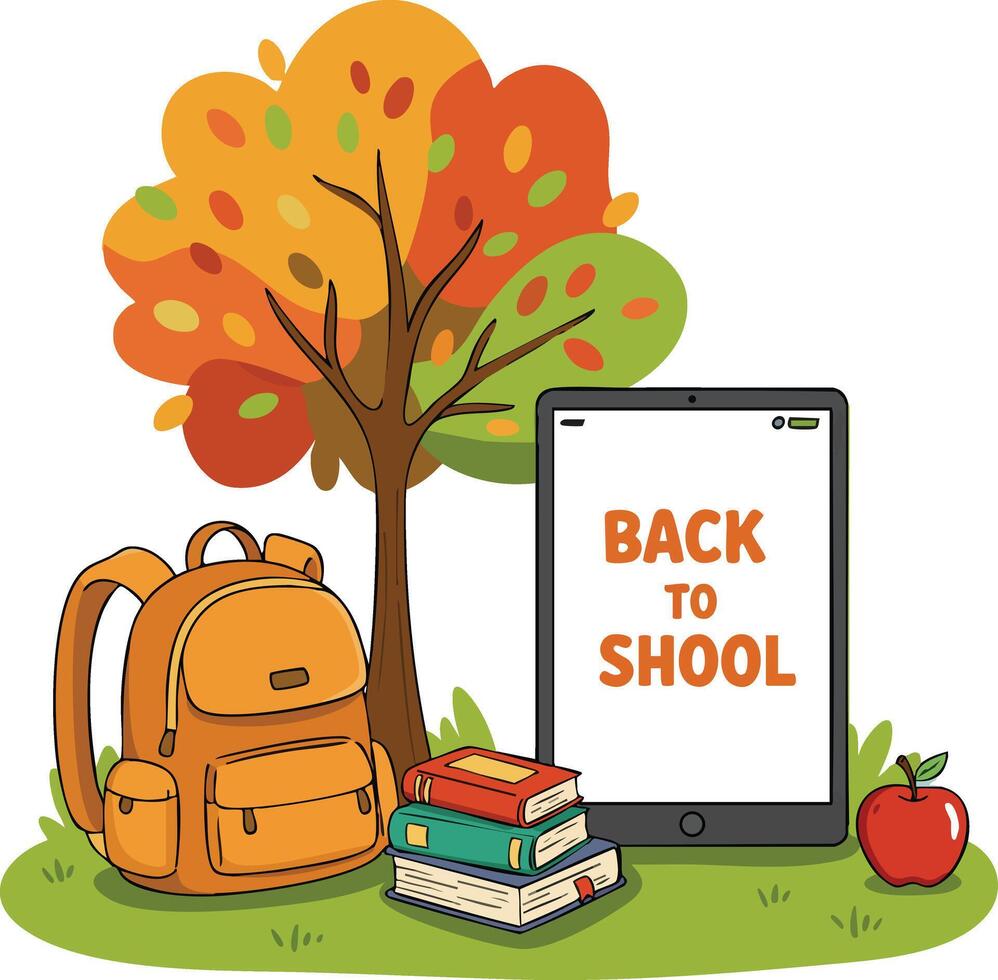 Autumn Tree with Backpack Books Apple and Tablet Showing Back to School Message Illustration for Learning and Study Concepts Pro Vector