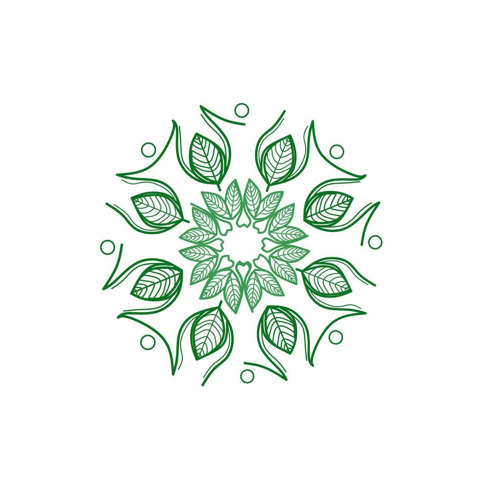 This green mandala features a symmetrical design of leaves and abstract figures, symbolizing nature, growth, and harmony in a clean, modern style. vector