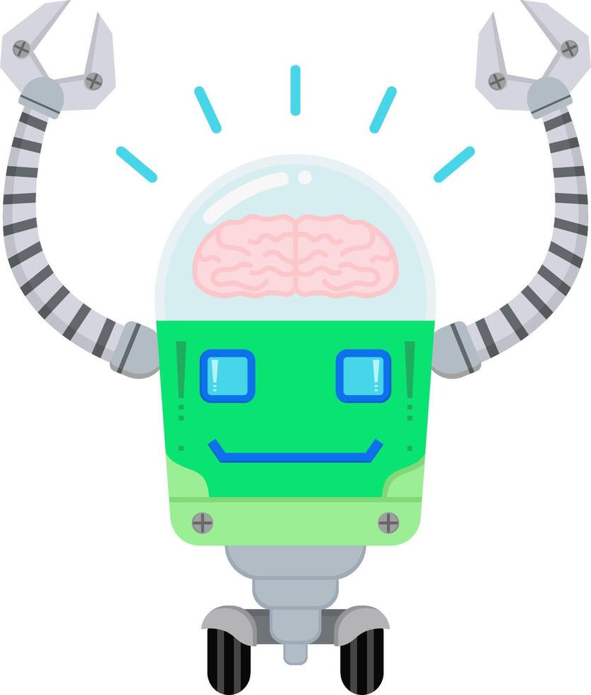 A Smiling Green Robot With A Human Brain In Its Head, Raising Its Two Mechanical Arms Pro Vector