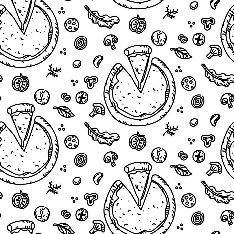 pattern of pizza dough with a triangular piece and ingredients next to it in doodle style. Engraving, monochrome hand-drawn drawing in a seamless texture. Scattered ingredients for adding to the pizza Pro Vector
