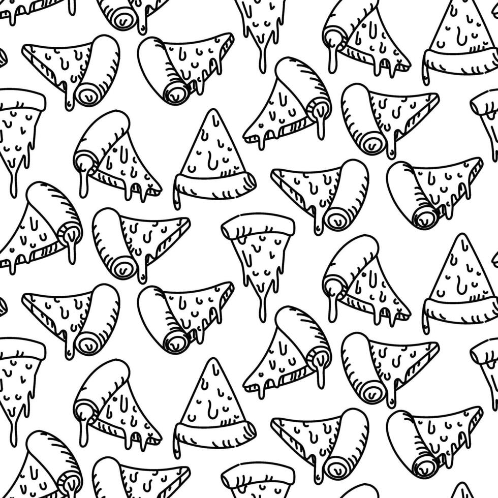 pattern of triangular pieces of cheese pizza in doodle style. An engraving, a monochrome hand-drawn pattern in seamless texture. pizza with cheese and a cheese rim. The slices are diverse and chaotic. Pro Vector