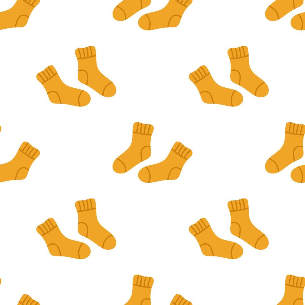 seamless pattern with cute pair of knitted socks. Print with cozy warm woolen socks in flat design. Seamless pattern with yellow socks on white background. Pro Vector