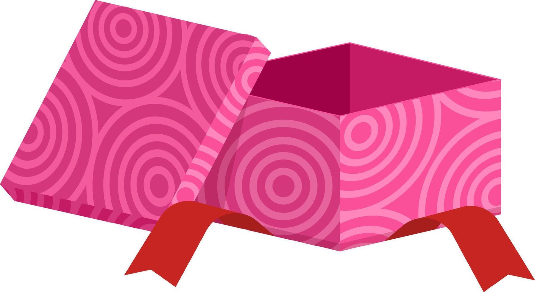 Pink open gift box adorned with a vibrant red ribbon and featuring a playful concentric circles pattern, showcasing its empty interior and inviting possibilities for a special present Pro Vector