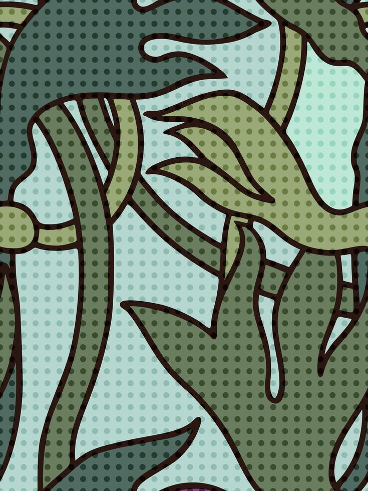Cool decorative botanical seamless background with abstract overlapping leaves and curved stems in green shades with dotted pop art effect Pro Vector