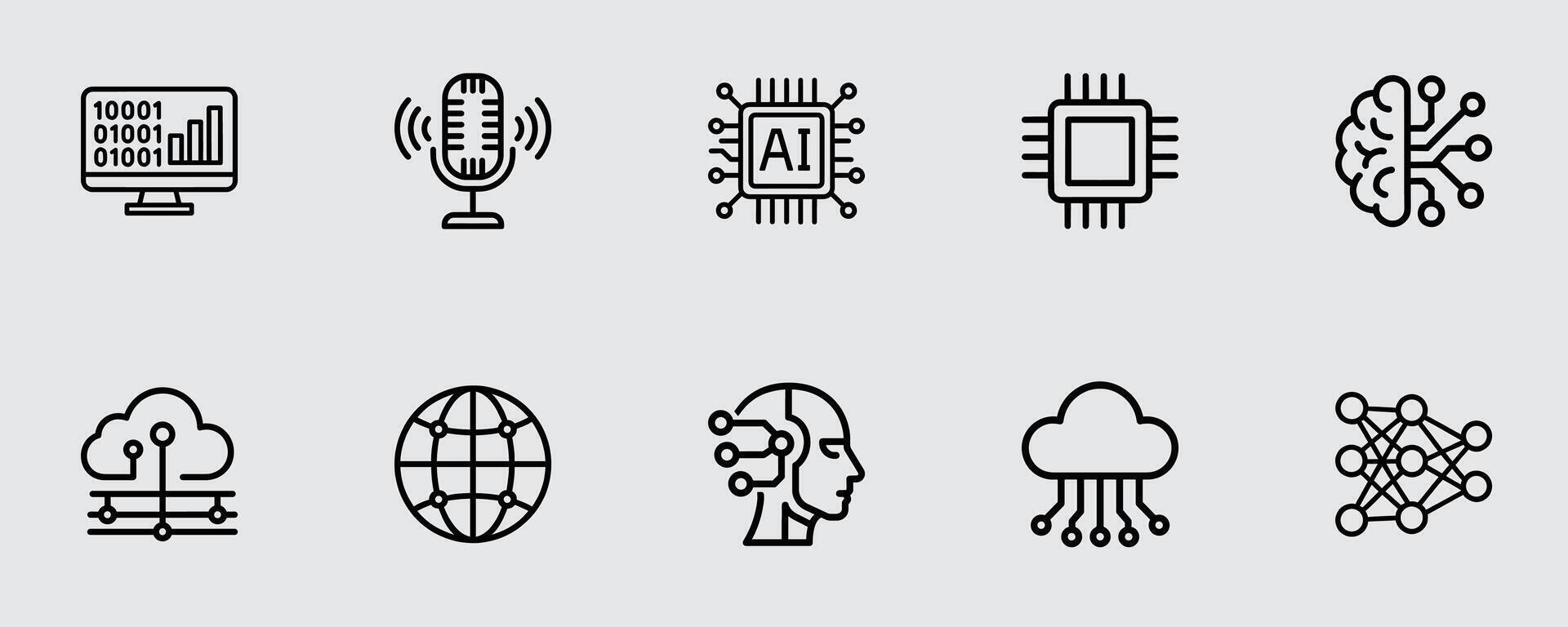 Set of minimalist black outline icons for artificial intelligence, data, and technology, including brain, chip, cloud, and network symbols. Pro Vector