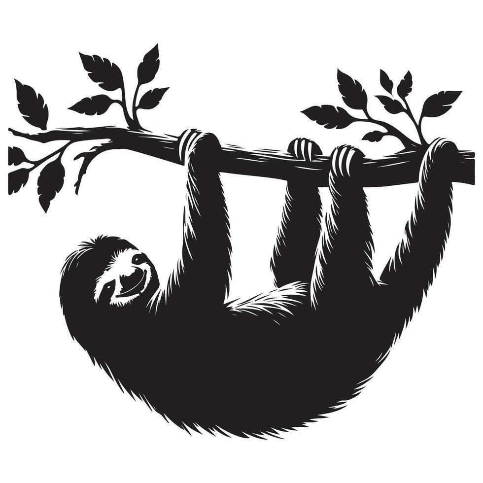 Lazy and Content Sloth Hanging Upside Down on Tree Branch Silhouette Art Pro Vector