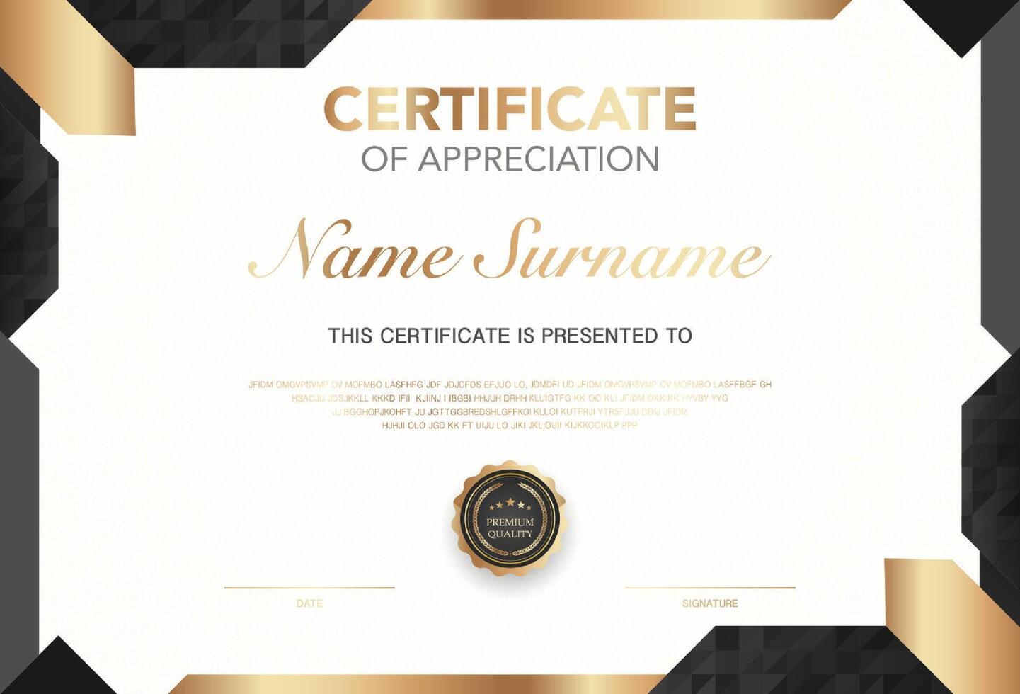 Modern certificate appreciation template with elegant gold and black design, premium quality badge, customizable name and signature area, perfect for awards, achievement or recognition Pro Vector