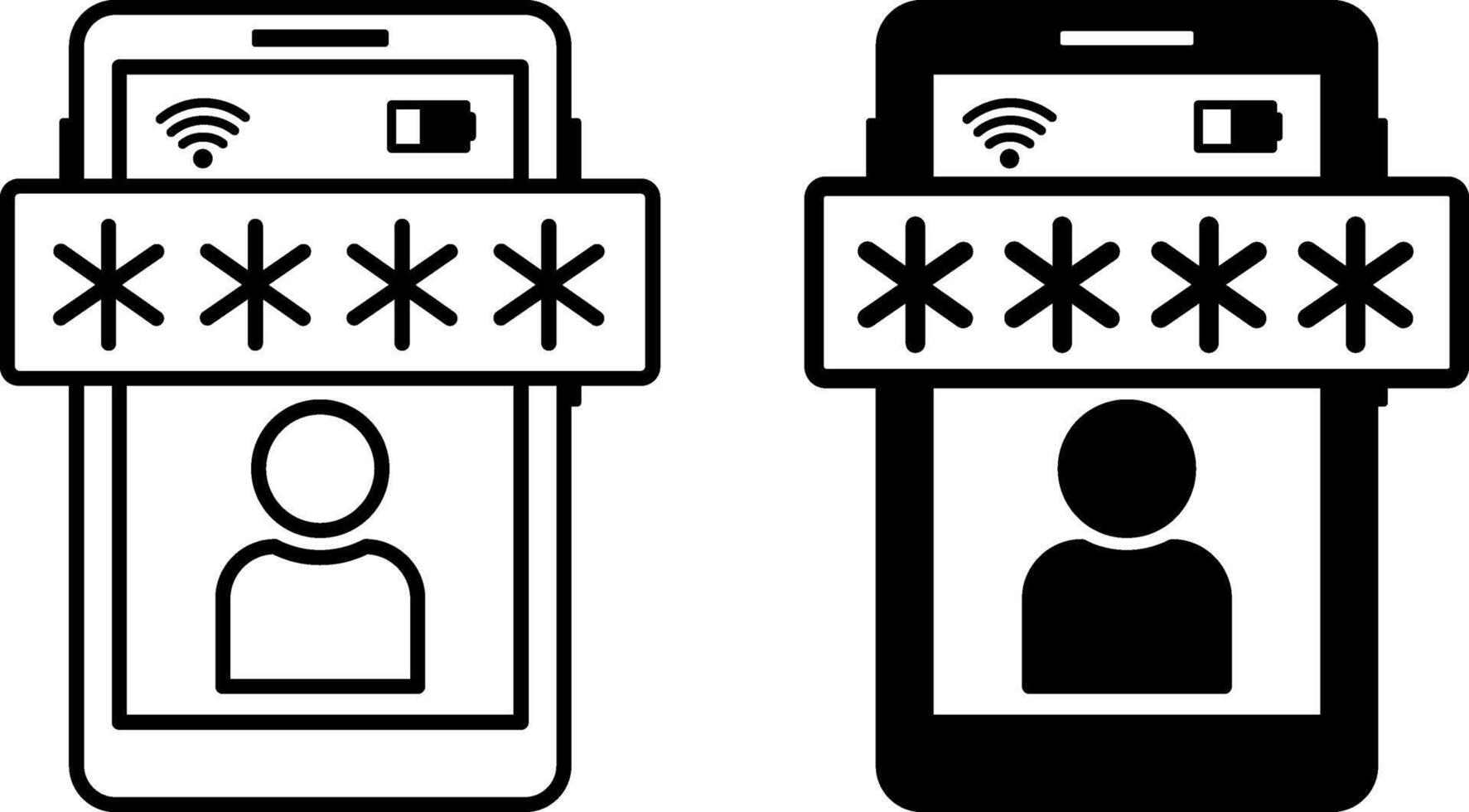 Phone Icons. Black and White Illustration. Mobile Phone, User, Login Code, Wi-Fi, and Low Battery. Password and Data Security Concept Pro Vector