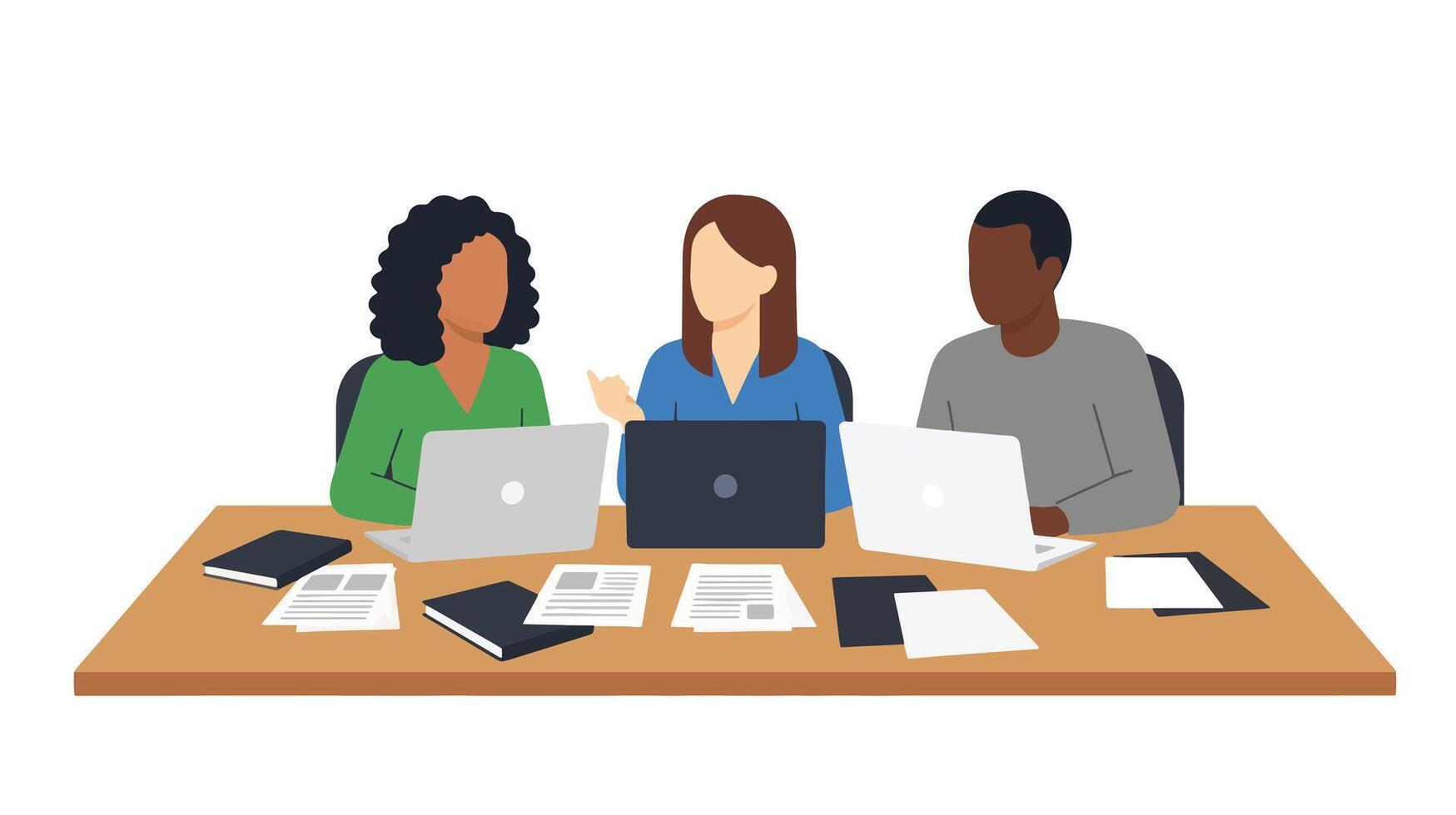 Diverse team of three faceless professionals collaborating at a table with laptops and documents Pro Vector