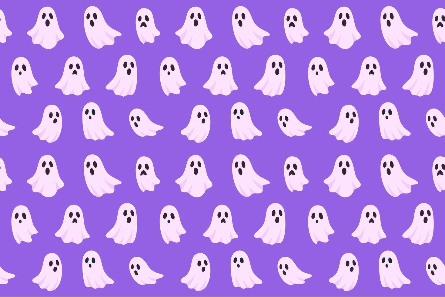 Seamless Halloween pattern with white ghosts on purple background. Perfect for wrapping paper, fabric, and spooky design projects Pro Vector