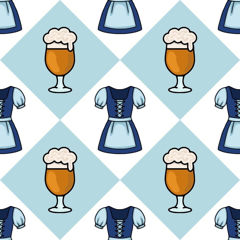 Seamless pattern featuring a whimsical Oktoberfest design with alternating illustrations of beer mugs and dirndl tops, set against a light blue diamondpatterned background. Pro Vector