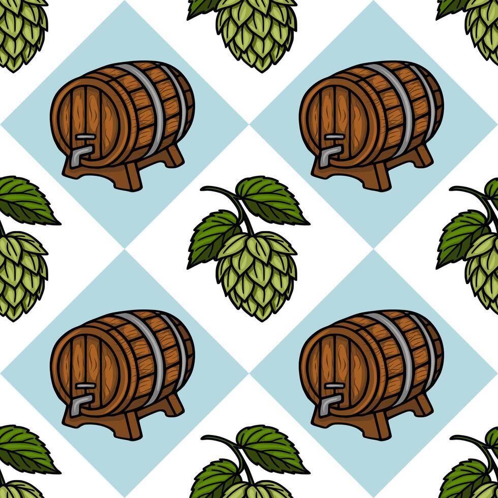 Seamless pattern featuring handdrawn illustrations of wooden beer barrels and hops on a light blue diamondshaped background, creating a rustic and festive design ideal for Oktoberfest or b... Pro Vector