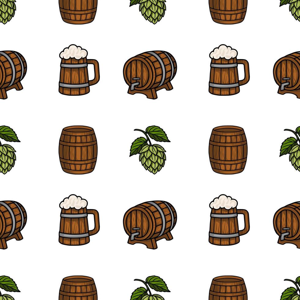 Seamless pattern featuring handdrawn wooden beer mugs, barrels, and hops, creating a rustic and festive Oktoberfest design. Pro Vector