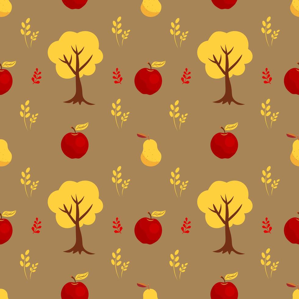 Seamless autumn pattern with trees and apples on a beige background Pro Vector