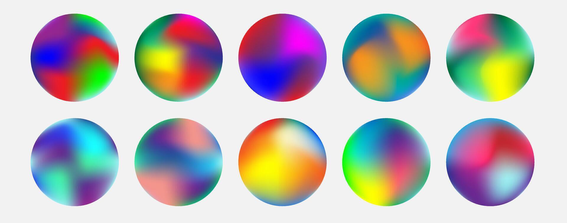 Set of bright mesh gradient circle in futuristic style. y2k hologram abstract liquid surface collection. Round iridescent shiny fluid holographic. Pro Vector