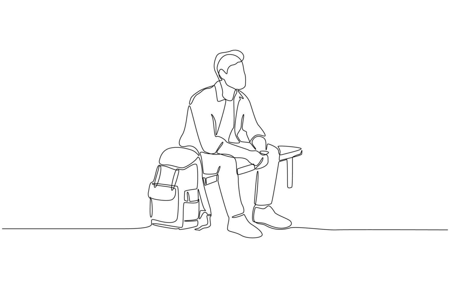 Continuous one line drawing of traveler sitting on bench with backpack, representing themes of waiting, travel, solitude, and self-reflection, single line art Pro Vector