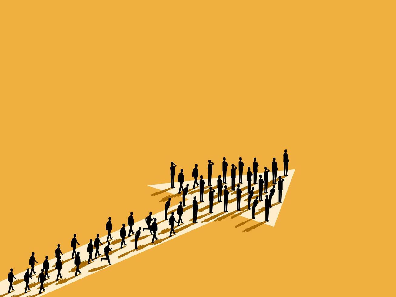 group of people stands in a line, forming an arrow pointing in the direction Pro Vector