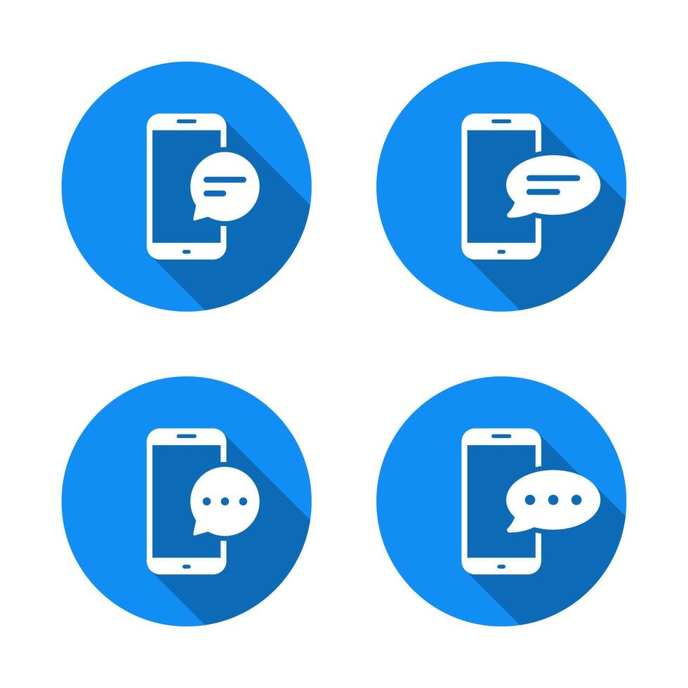 Chat message icon on smartphone screen with long shadow. Mobile phone with speech bubble symbol Pro Vector
